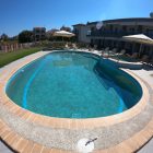 3) Finikas Semi-basement Family Apartment: polusturen, 2+4 osobe, 42 m2, ima spavaću sobu sa bračnim krevetom (1,60m), dnevno-spavaću sobu sa 2 kauča za 2 osobe koja se mogu pretvoriti u 4 singl ležaja, opremljenu odvojenu kuhinju, kupatilo sa tuš kabinom, privatna terasa sa malom baštom, privatni parking, pogled na baštu i bazen